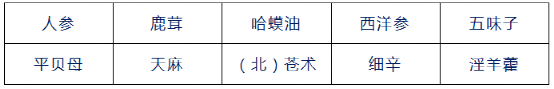 剌五加、五味子、人參、西洋參、漢麻(火麻仁)、關(guān)防風(fēng)、赤芍、板藍(lán)根、鹿茸