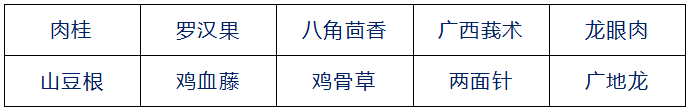 鐵皮石斛、衢枳殼、烏藥、三葉青、覆盆子、前胡、靈芝、西紅花