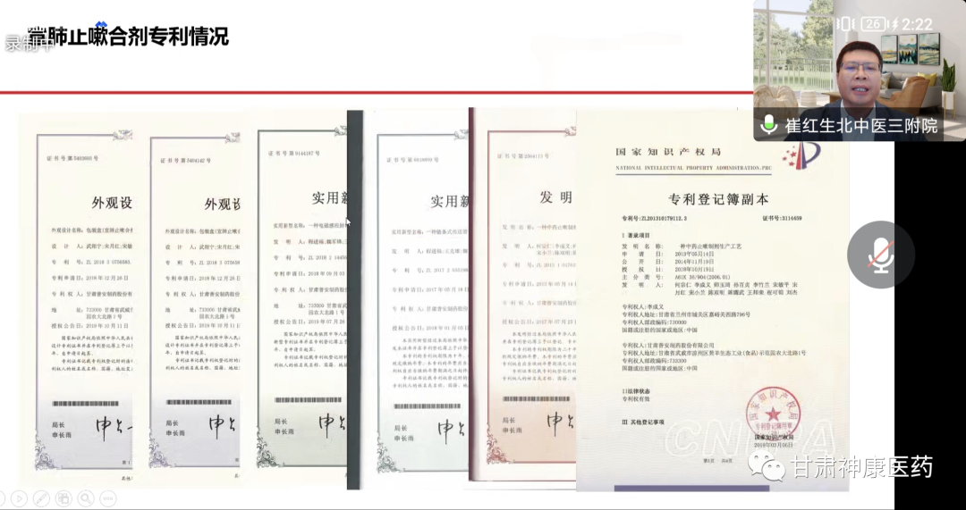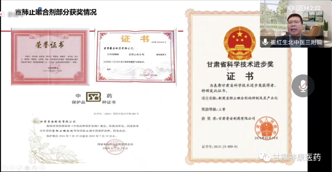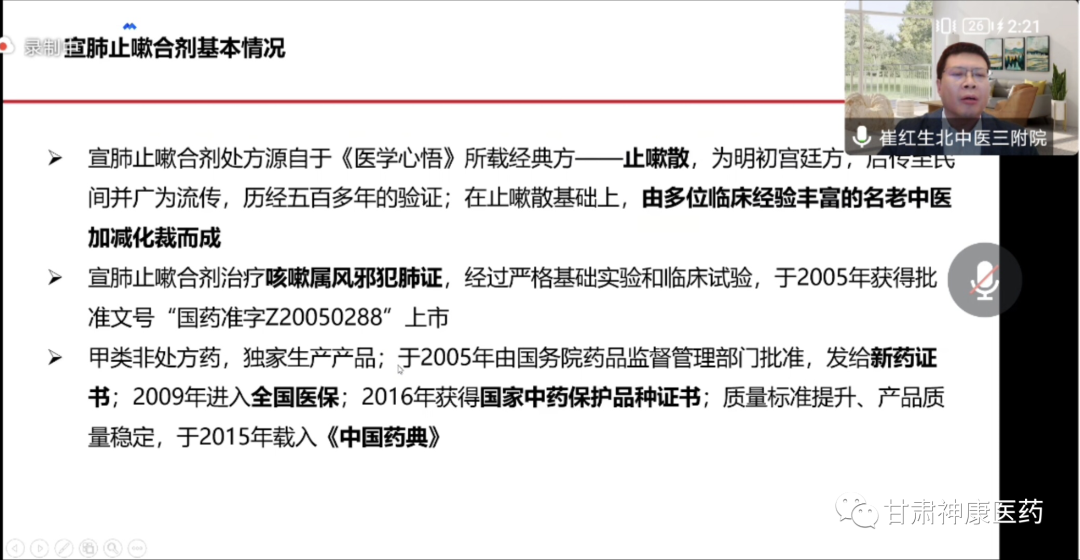 會上,由北京中醫藥大學第三附屬醫院崔紅生教授對宣肺止嗽合劑處方來源、獲獎專利、安全性等做了詳細的介紹。