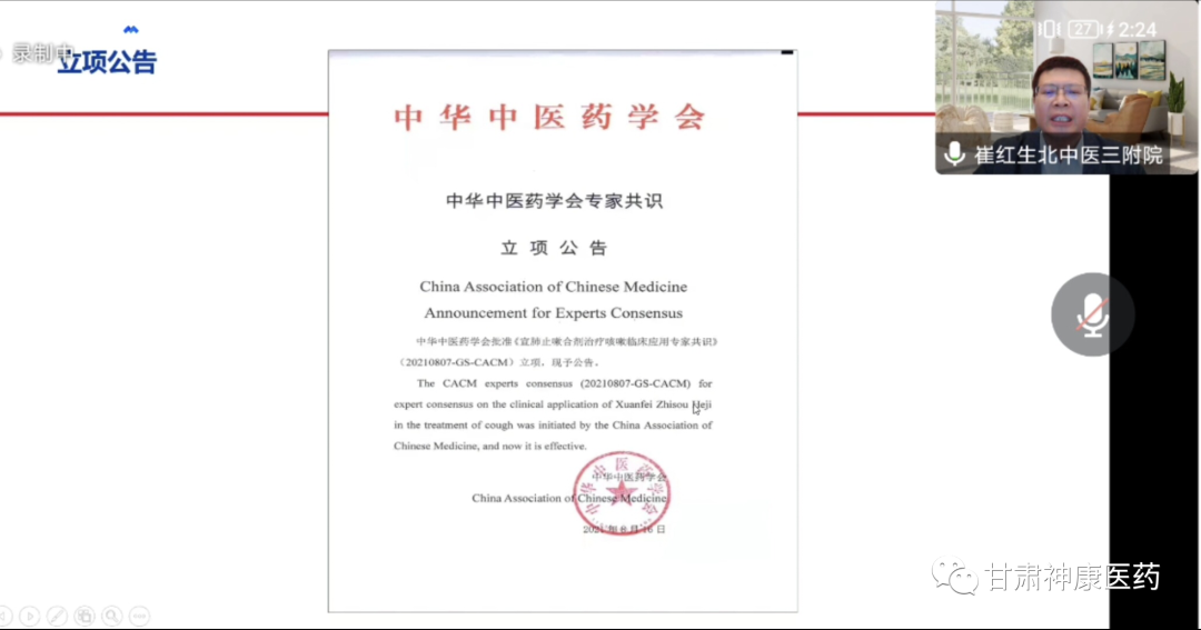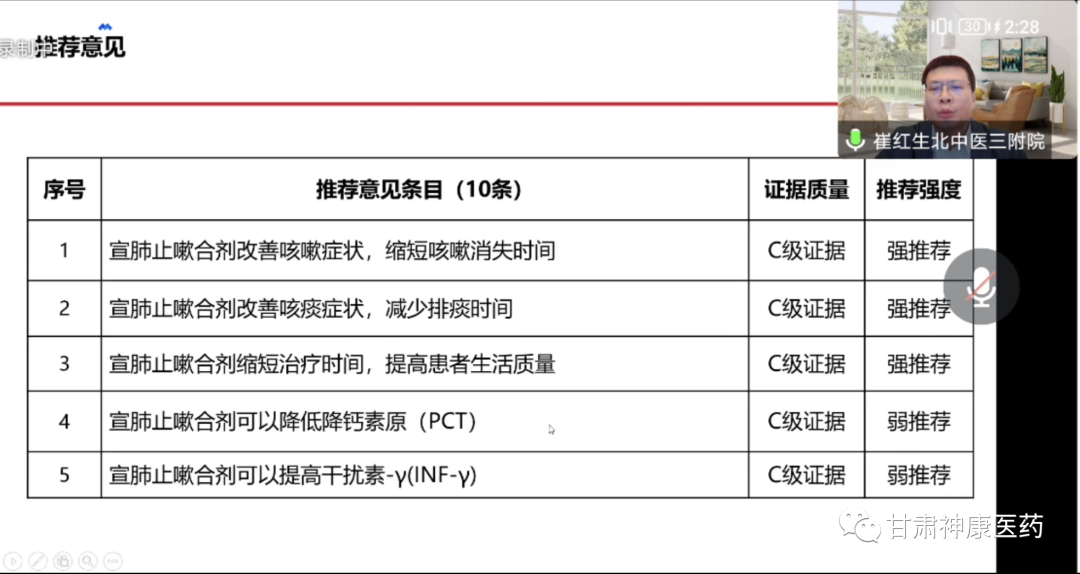 最后,崔教授對宣肺止嗽合劑在新冠肺炎疫情防控中展示出了獨特的治療價值和國藥魅力做了介紹,宣肺止嗽合劑在2022年3月,分別被列入《上海市新型冠狀病毒感染中醫藥診療專家共識》(2022年春季版)與《甘肅省新型冠狀病毒肺炎中醫藥防治方案(第四版)》。并于2022年5月,在上海中醫藥大學附屬曙光醫院開展了宣肺止嗽合劑治療新型冠狀病毒肺炎真實世界的相關研究,為后期循證證據搭建提供研究思路。