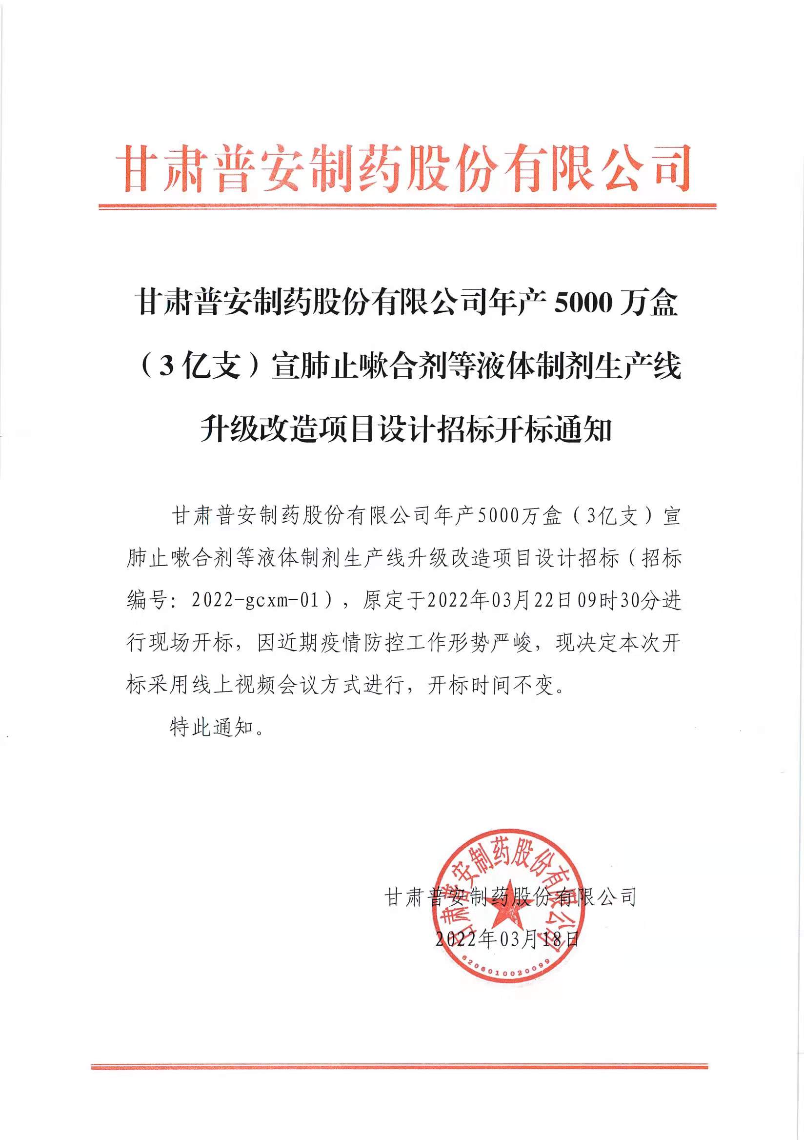 甘肅普安制藥股份有限公司年產5000萬盒(3億支)宣肺止嗽合劑等液體制劑生產線升級改造項目設計招標開標通知