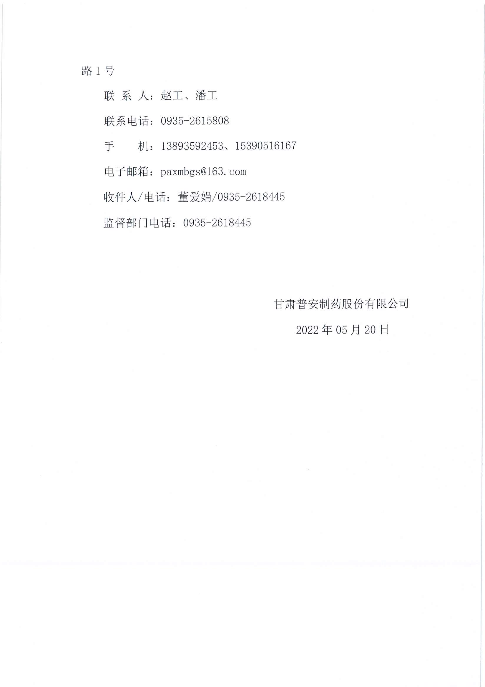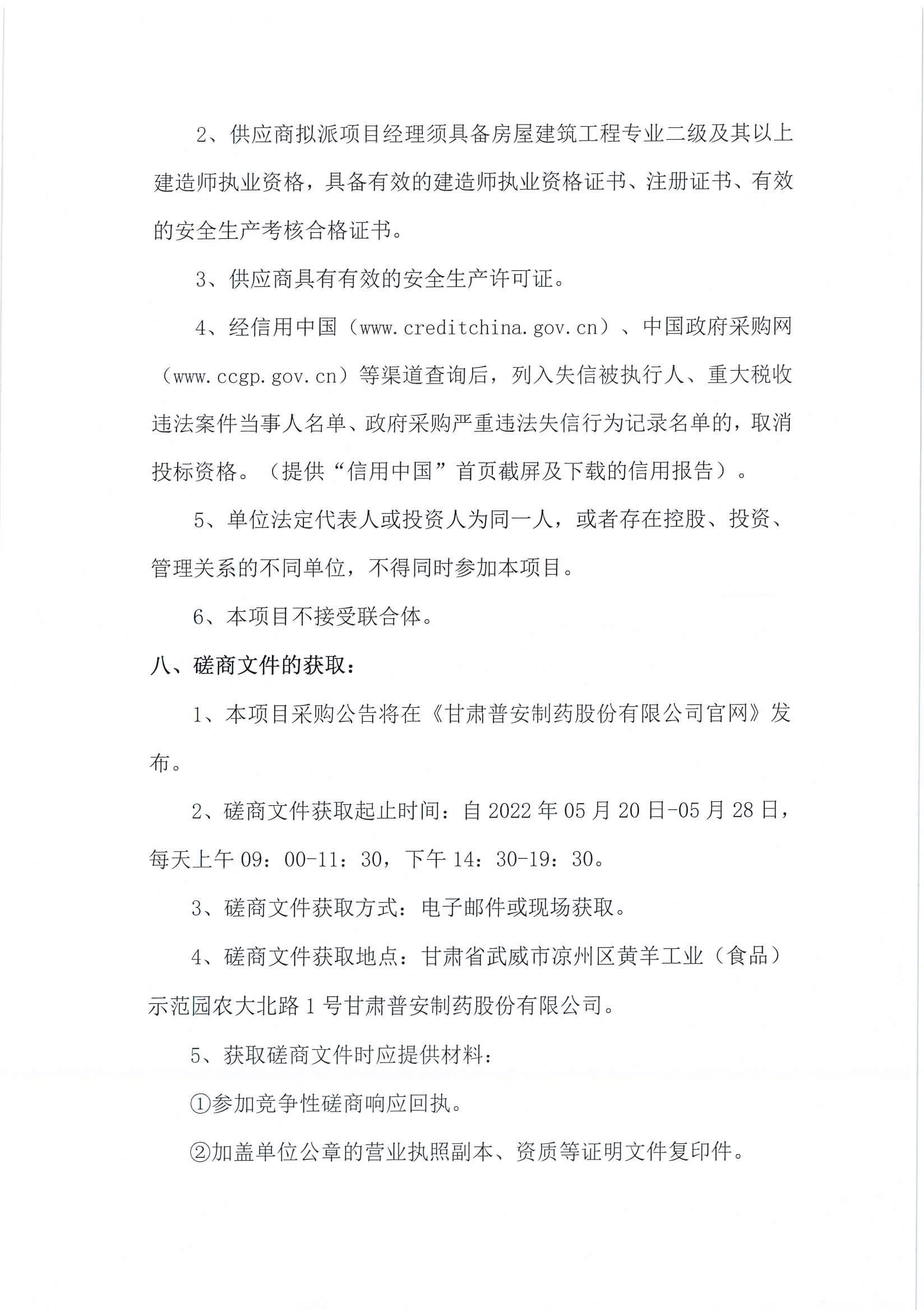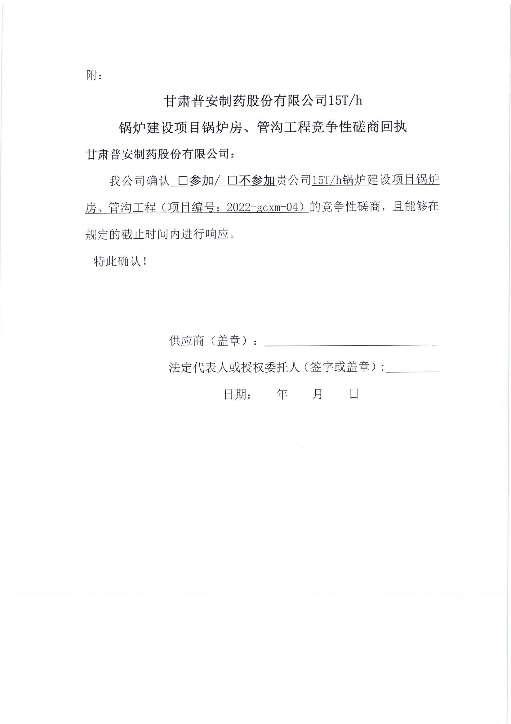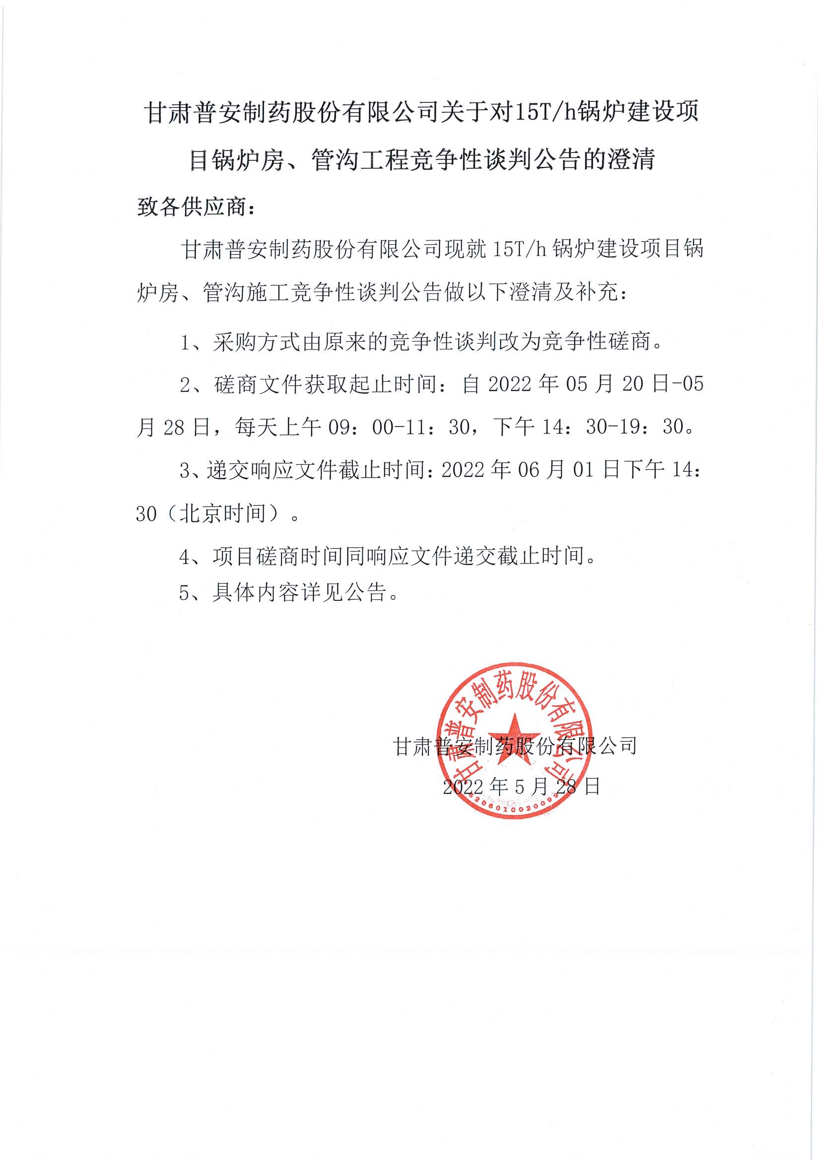 甘肅普安制藥股份有限公司關(guān)于對(duì)15T/h鍋爐建設(shè)項(xiàng)目鍋爐房、管溝工程競(jìng)爭(zhēng)性談判公告的澄清