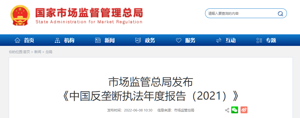 6月8日,國家市場監督管理總局發布《中國反壟斷執法年度報告(2021)》,(以下簡稱《報告》)。《報告》指出,2021年,我國市場公平競爭秩序穩步向好,反壟斷和防止資本無序擴張取得重要成效。
