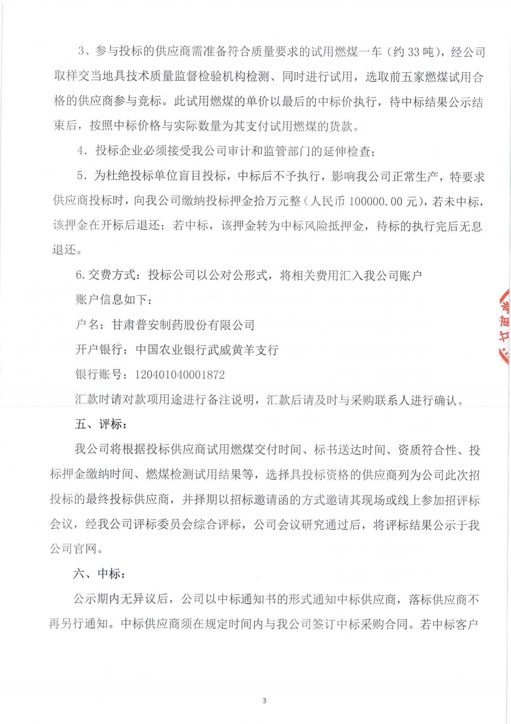 甘肅普安制藥股份有限公司燃煤公開招標采購公告