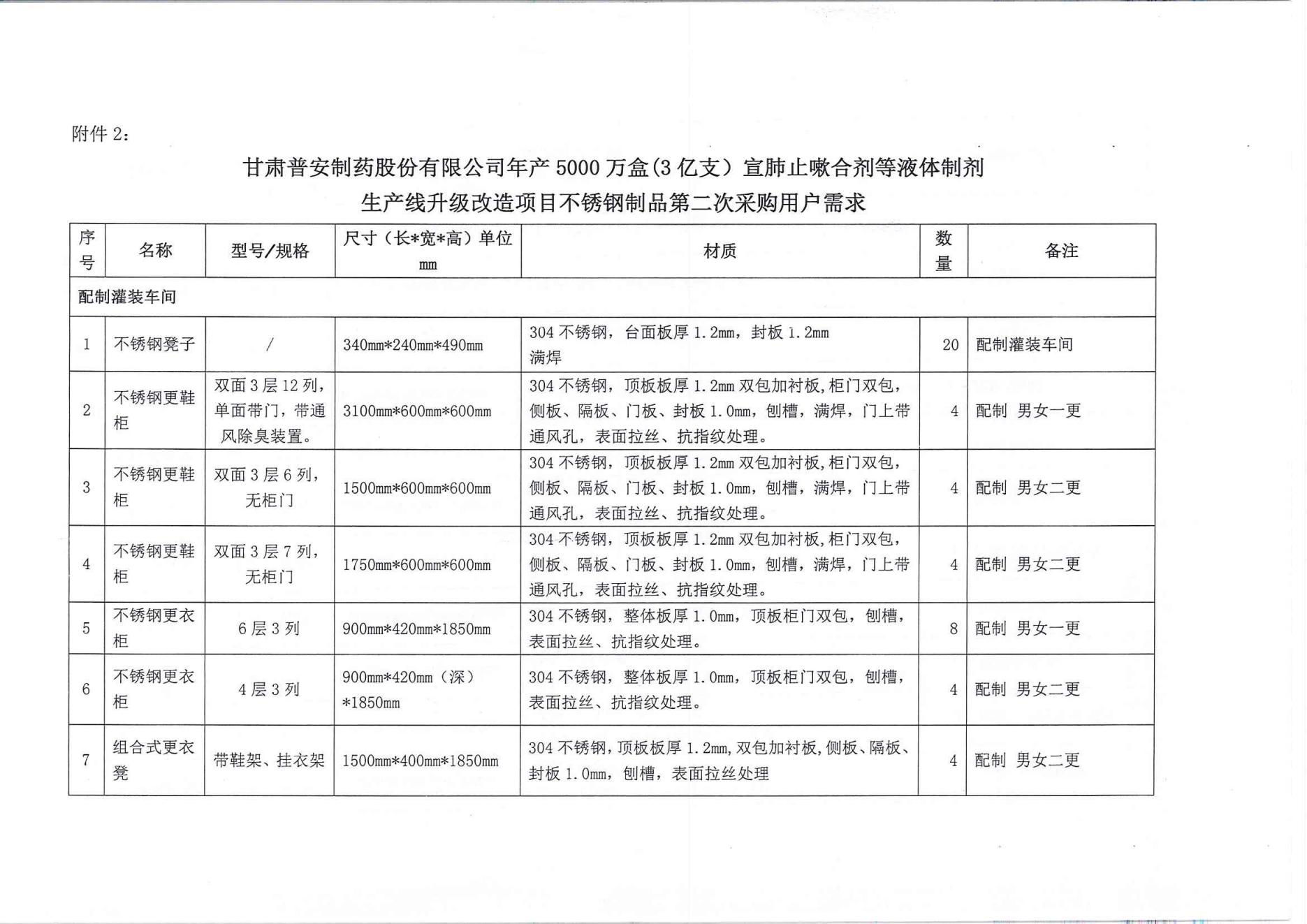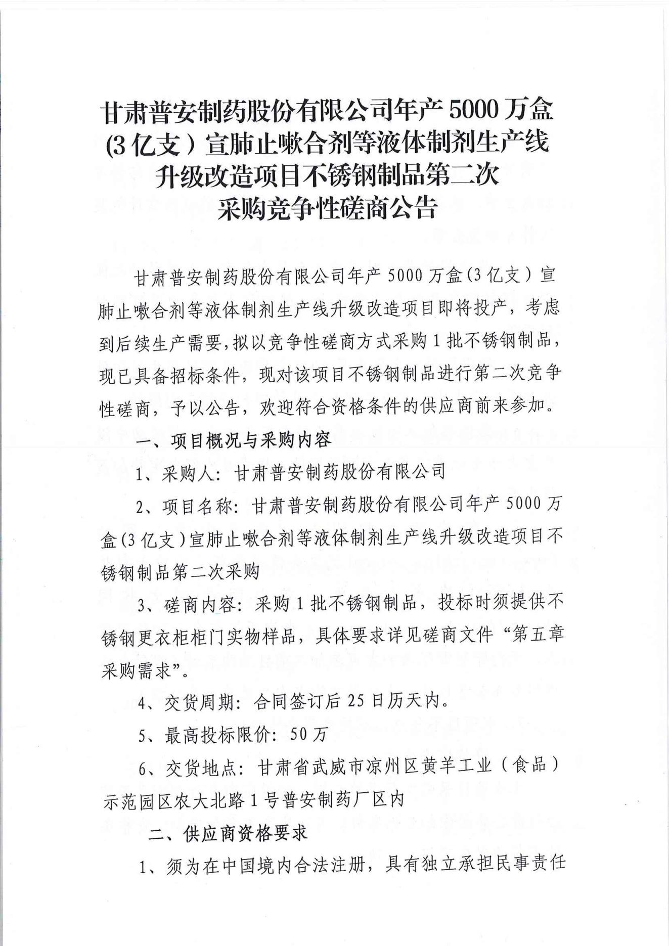 甘肅普安制藥股份有限公司年產5000萬盒(3億支)宣肺止嗽合劑等液體制劑生產線升級改造項目不銹鋼制品第二次采購競爭性磋商公告