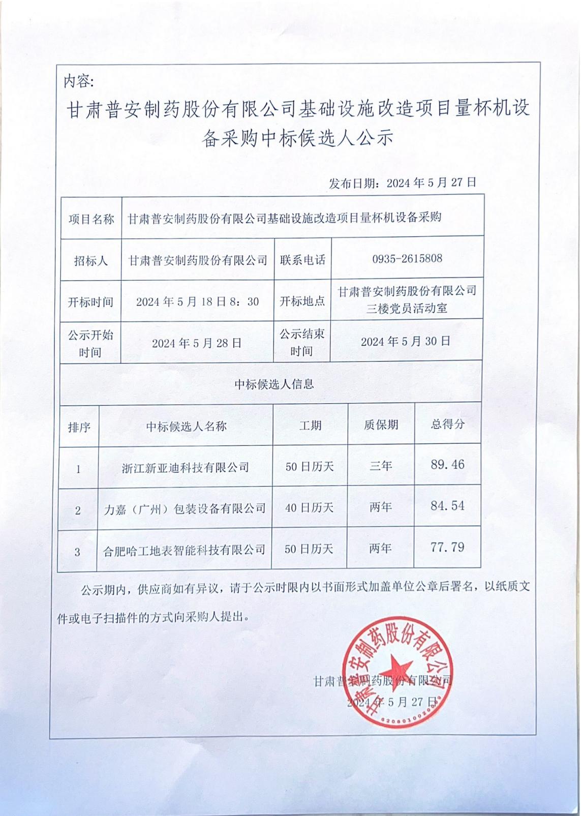 甘肅普安制藥股份有限公司基礎(chǔ)設(shè)施改造項(xiàng)目量杯機(jī)設(shè)備采購(gòu)中標(biāo)候選人公示