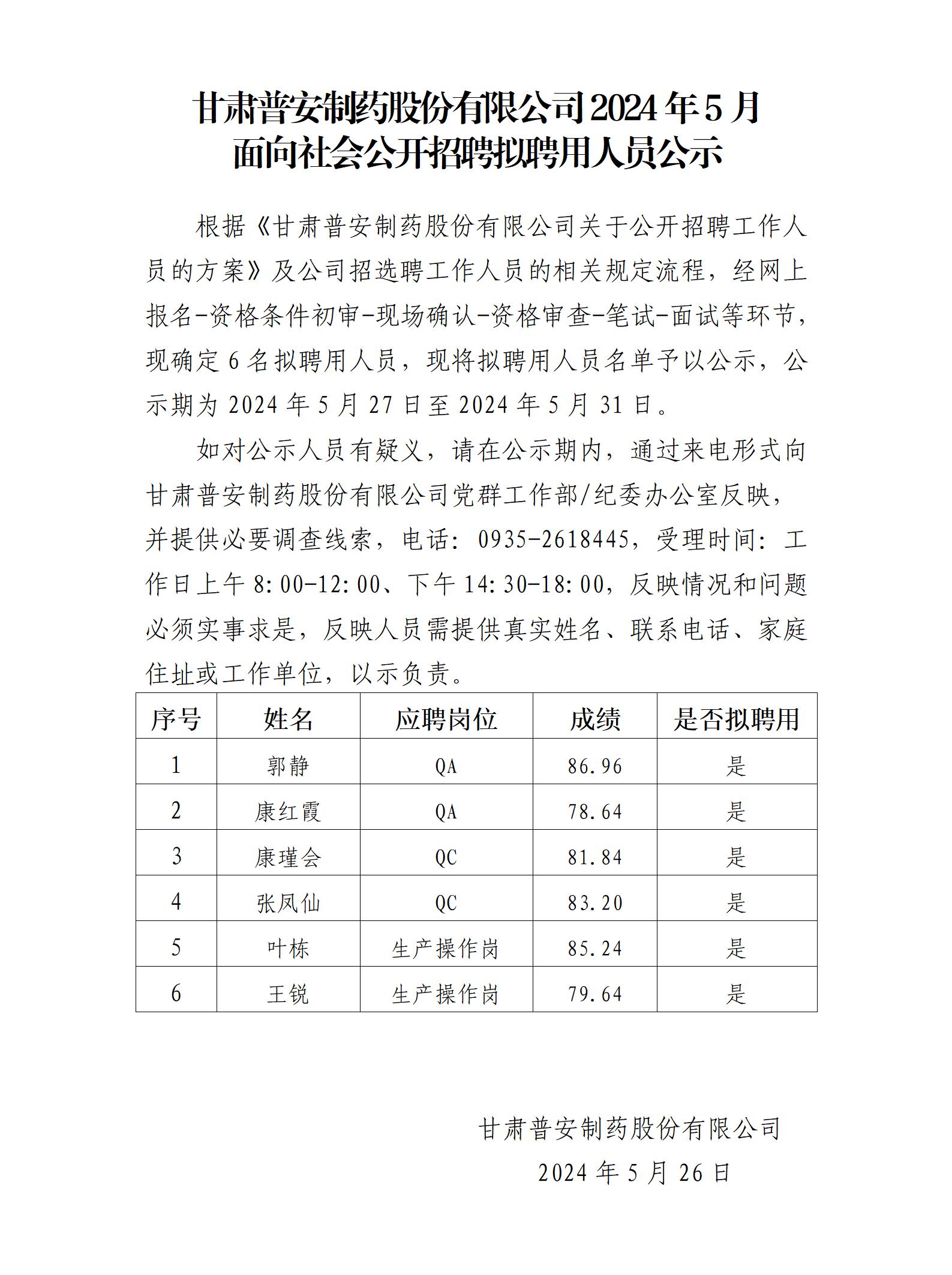 甘肅普安制藥股份有限公司2024年5月面向社會公開招聘擬聘用人員公示