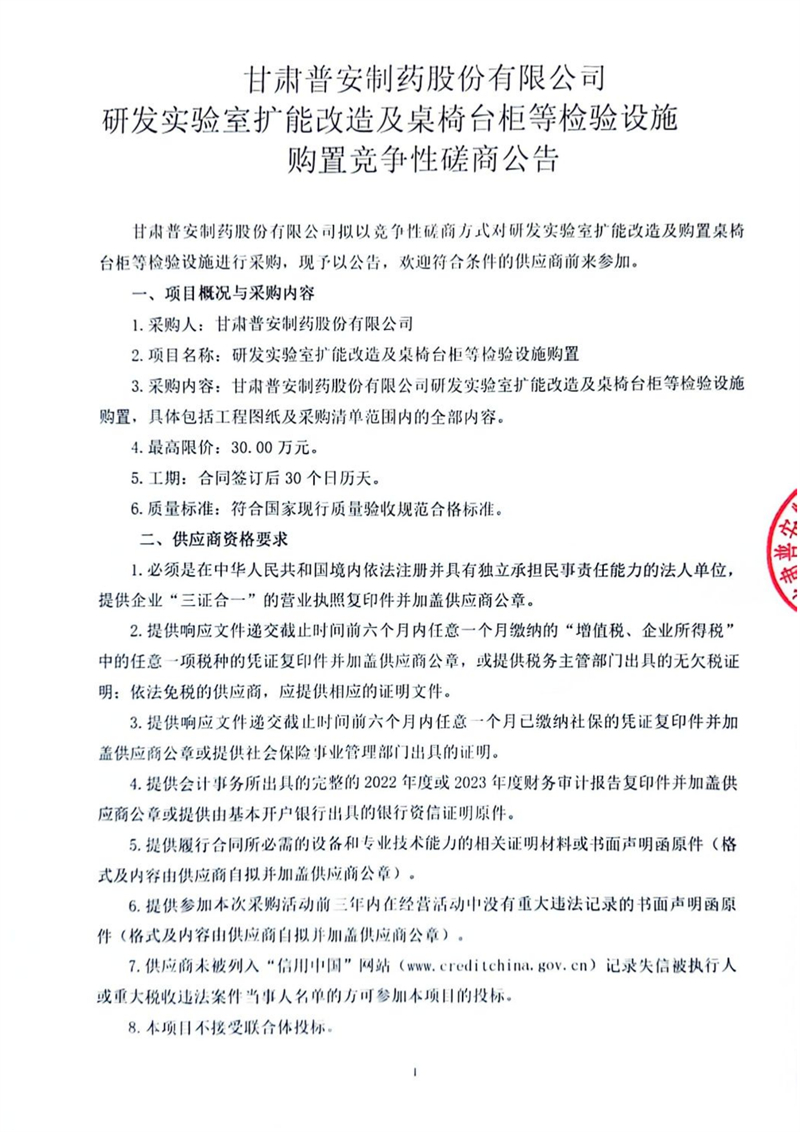 甘肅普安制藥股份有限公司研發(fā)實(shí)驗(yàn)室擴(kuò)能改造及桌椅臺(tái)柜等檢驗(yàn)設(shè)施購(gòu)置競(jìng)爭(zhēng)性磋商公告