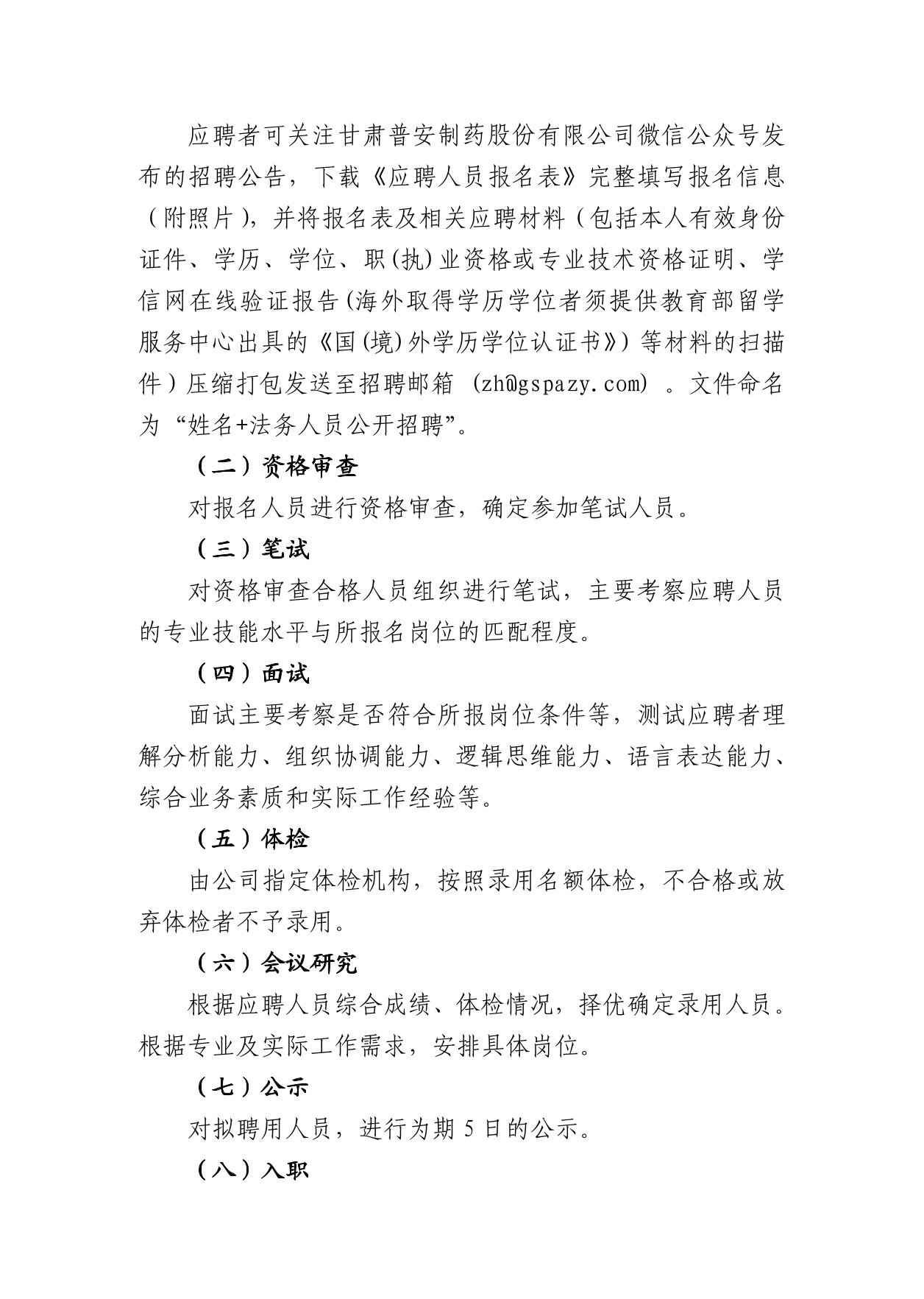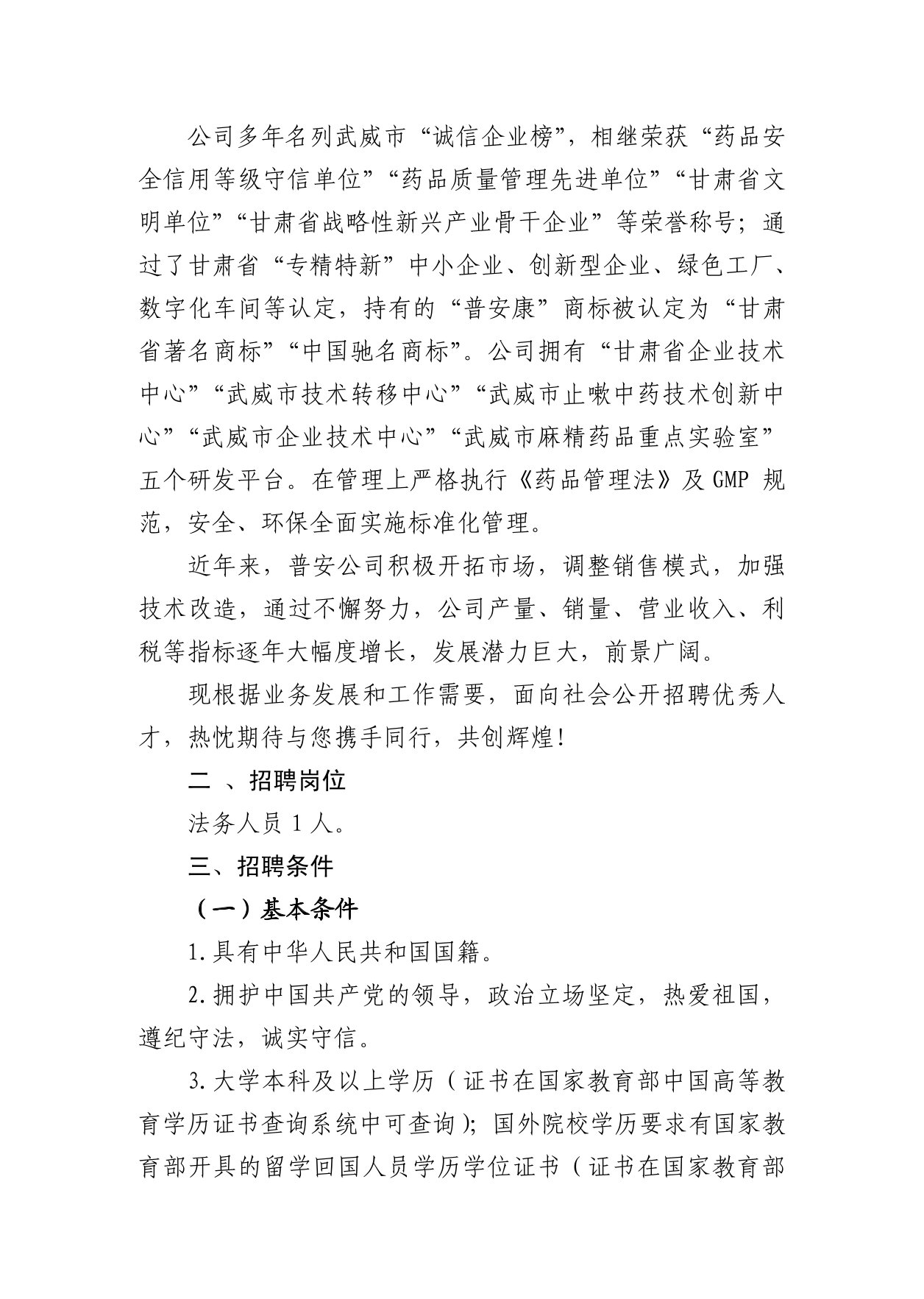 甘肅普安制藥股份有限公司 關于公開招聘法務人員的公告