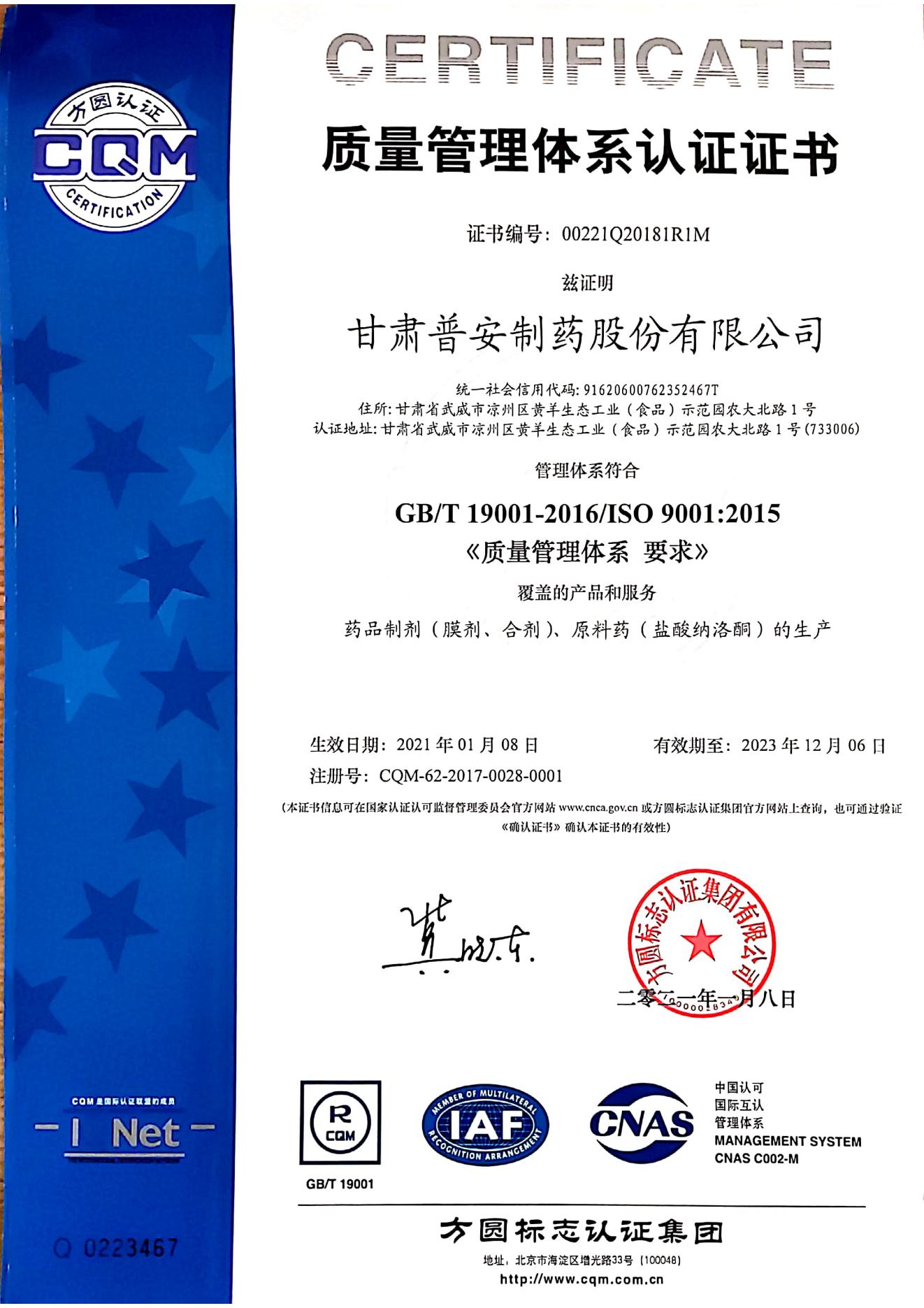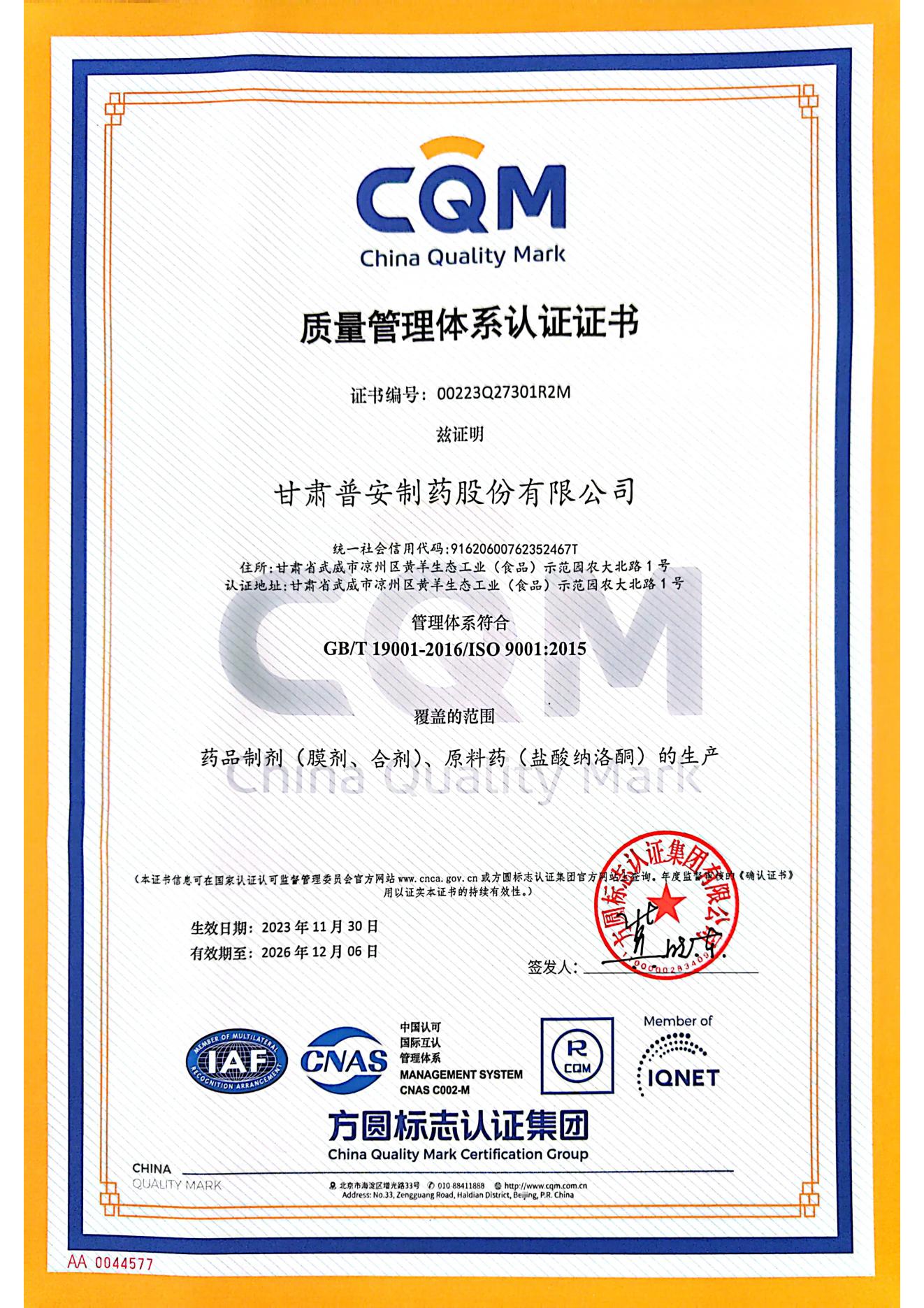 質量管理體系認證證書